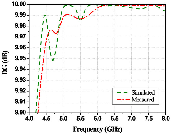 Diversity gain (DG) quantifies the reduction in signal fading caused by multipath propagation and is used to evaluate the signal reliability of the dual-element MIMO antenna. The DG between antenna elements can be calculated using Equation (13) [35]. As shown in Figure 21, the simulated and measured DG of the proposed dual-element antenna scheme exceed 9.98 dB.