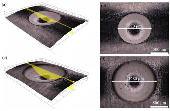 The macroscopic morphology of FODed crater: (a,b) are the overall feature and surface diameter characteristics at v = 100 m/s; (c,d) are the overall feature and surface diameter characteristics at v = 167 m/s.