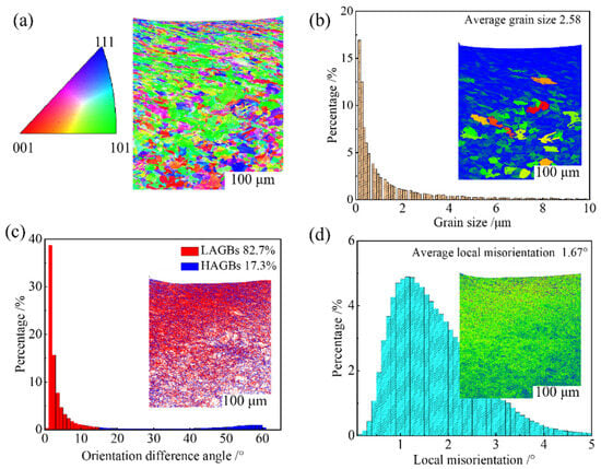 EBSD morphologies of USRPed + FODed-v = 100 m/s treated specimen: (a) inverse pole figure; (b) grain size; (c) grain boundaries; (d) KAM map.