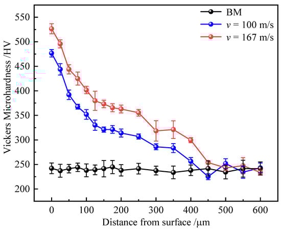 The gradient distributions of microhardness with error bars below the foreign object impacted crater are presented in Figure 7. The surface microhardness of the crater bottom reaches 526 HV (v = 167 m/s) and 476 HV (v = 100 m/s) from the initial value of 245 HV. Microhardness exhibits a gradient decline from the surface, converging to the base material value (≈245 HV) at ≈450 μm depth.