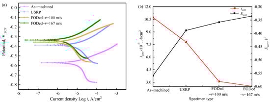 Figure 8a presents the polarization curves of diverse specimens within a 3.5% NaCl solution. The potentiodynamic polarization curves of the distinct specimens exhibit a largely consistent trend. Compared with the as-machined specimen, the corrosion potential of the axle specimen after being strengthened and impacted by foreign object shows a positive shift, and the value increases. The experimental results were calculated and analyzed by Tafel extrapolation method, and the corrosion potentials, Ecorr and current densities, icorr of various specimens were obtained, as illustrated in Figure 8b. The as-machined surface exhibited the most active corrosion potential, indicating heightened corrosion susceptibility and accelerated degradation kinetics in corrosive environments. The as-machined surface exhibits peak corrosion current density, reflecting accelerated anodic dissolution kinetics and maximum corrosion aggressivity in the test electrolyte. However, after the surface strengthening treatment and object impact, the corrosion current density value of the sample is significantly reduced, and the corrosion resistance of the sample is significantly improved, which is mainly due to the residual compressive stress-induced and surface grain refined by both the USRP and foreign object impact [20,21]. In particular, in these two kinds of damage, the larger foreign object impact velocity can better improve the corrosion resistance of the axle sample.