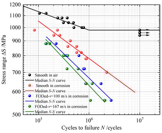 Figure 9 demonstrates that foreign object impact velocity governs the corrosion fatigue strength of axle specimens. Specifically, as the impact speed increases, the corrosion—fatigue strength of the specimen—decreases. The defects introduced on the surface of the axle specimen by the impact of foreign object cause geometric notches and uneven distribution of residual stress. Generally, the damage degree of the defect can be expressed by the theoretical stress concentration coefficient, Kt = 1 + 2√(d/r), where d is the defect depth, and r is the defect radius that is equivalent to the radius of the foreign object [27,32]. In addition, according to the Peterson’s formula [33], the fatigue notch coefficient Kf can be expressed as Kf = 1 + (Kt−1)/(1 + a*/r), where a* is the material constant. Hence, with the increase in defect depth d, the stress concentration coefficient Kt and fatigue notch coefficient Kf increase, the damage of the axle specimen increases, and the corrosion fatigue strength decreases.