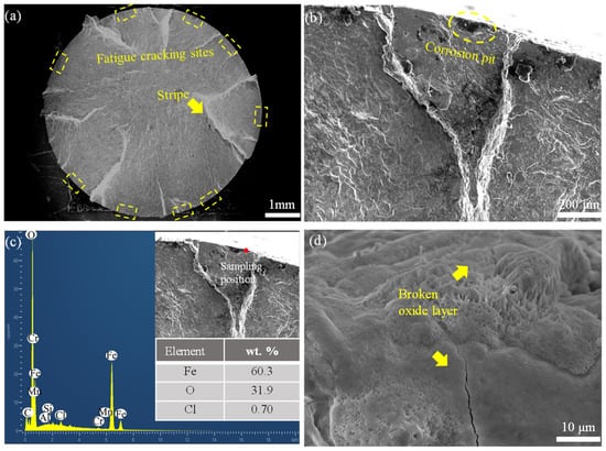 Fracture characteristics of a smooth specimen in NaCl environment at a stress range of 860 MPa, Nf = 383,250: (a) macroscale view of the fracture surface; (b) a magnified view of a corrosion pit; (c) EDS energy spectra of corrosion pit; (d) broken oxide layer.