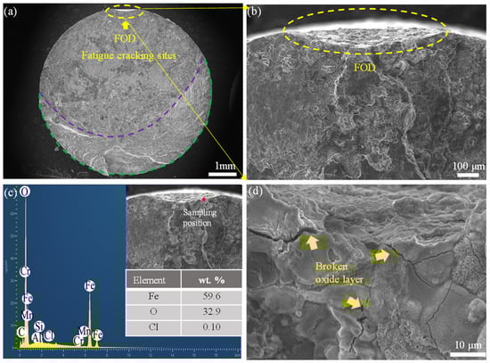 Fracture characteristics of a USRPed + FODed-v = 167 m/s specimen in NaCl environment at a stress range of 720 MPa, Nf = 368,061: (a) macroscale view of the fracture surface; (b) a magnified view of the impact crater (c) EDS energy spectra of impact crater; (d) broken oxide layer.