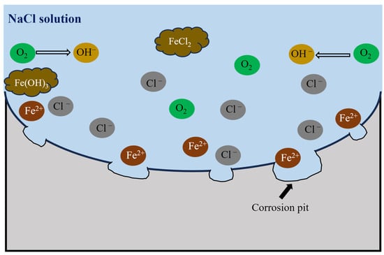 According to the Fe and O elements quantitative analysis in Figure 10c, it is hypothesized that the formation of corrosion pits on the EA4T steel in NaCl solution includes the following electrochemical reactions [28]: