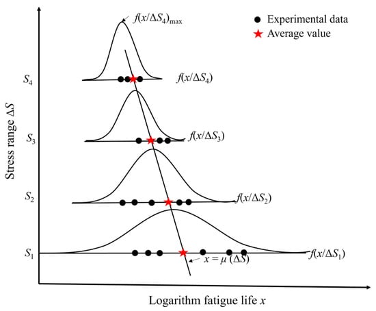 Within this framework, x denotes the logarithmic fatigue life, defined as x = log (Nf), where Nf represents the number of cycles to failure. The variable ΔS corresponds to the applied stress, while μ(ΔS) and σ(ΔS) denote the mean value and standard deviation of x conditioned on the stress level ΔS. The term yx quantifies the probability density of the logarithmic fatigue life (x) at each respective stress level ΔS.