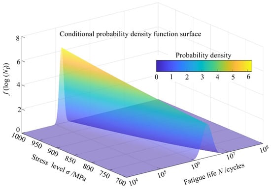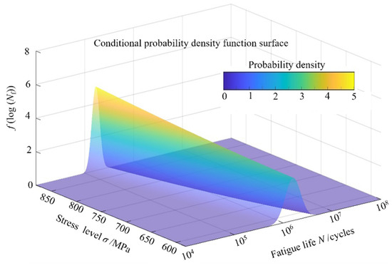 As indicated by the CPDF, the conditional probability density distribution curve generates a conditional probability density function surface under varying stress levels. This surface facilitates the characterization of the probability density distribution for logarithmic fatigue life (x), treated as a random variable, at each distinct stress level ΔS within a three-dimensional coordinate system [38]: