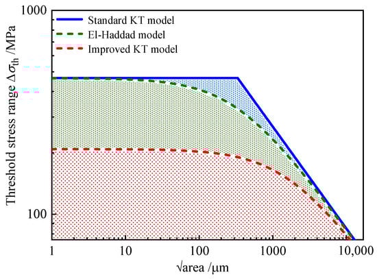 The classical KT diagram establishes fundamental correlations between fatigue limits and crack growth thresholds, unifying nominal stress-based design and damage tolerance methodologies to enable reliable defect assessment in engineering structures [35,36]. Typically, the horizontal axis of the KT diagram denotes the fatigue limit of the smooth specimen, while the diagonal line represents the threshold stress range, Δσth: