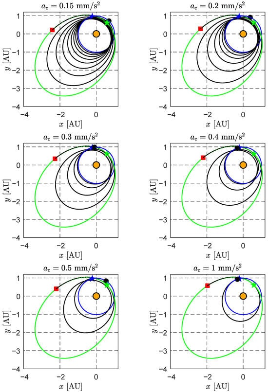 - Pezent, J.B.; Sood, R.; Heaton, A.; Miller, K.; Johnson, L. Preliminary trajectory design for NASA’s Solar Cruiser: A technology demonstration mission. Acta Astronaut. 2021, 183, 134–140. [Google Scholar] [CrossRef]