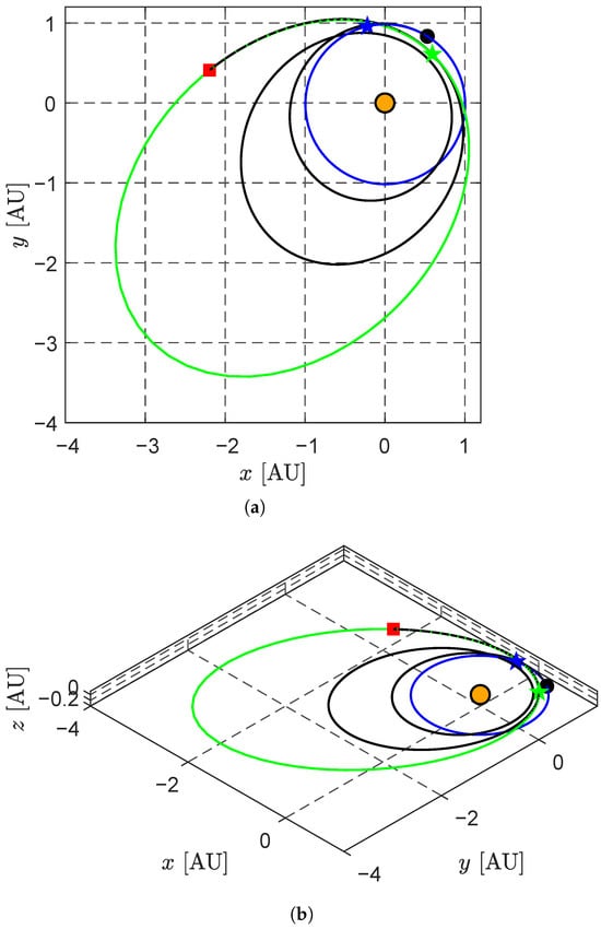 - Bate, R.R.; Mueller, D.D.; White, J.E. Fundamentals of Astrodynamics; Dover Publications: New York, NY, USA, 1971; Chapters 4 & 7, pp. 212–222 & 321–355. ISBN 0-486-60061-0. [Google Scholar]