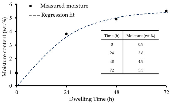 The nylon filament exhibits a dramatic increase in moisture content with the extended dwelling time in the humidity chamber. It is noted that even the virgin nylon filament (0 h, no moistening) contains about 1 wt.% water, which can be ascribed to moisture absorption during the filament production. The regression fit of the measured moisture versus dwelling time (excluding 0 h) can be expressed using Equation (2).