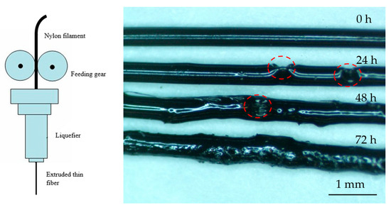 In this study, nylon filament samples were placed in the humidity chamber at various dwelling times (four levels) to absorb moisture. As a hygroscopic material, nylon filament was moistened at a fast rate, as shown in Figure 1.
