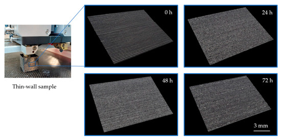 Four thin-wall samples were printed using moistened filaments to investigate the effect of moisture on the surface finish of 3D-printed nylon parts. The lateral walls were analyzed using a Keyence automatic 3D measuring macroscope (height measurement accuracy ±3 µm). The results revealed a significant decline in surface quality, attributed to the deterioration of nylon strands with increased moisture content. Figure 3 illustrates the changes in surface finish corresponding to specific moistening times (or elevated moisture levels) of the nylon filaments.