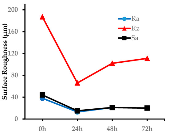 In addition to the optical microscopy, the surface quality was also assessed using the scanned surface profile. The Ra and Rz evaluations were conducted with an orientation along the building direction (perpendicular to the layers as shown in Figure 4). The areal average roughness (Sa) was evaluated over the entire region. Periodic peaks and valleys were observed in the roughness profile, using the Keyence macroscope. The Ra, Rz, and Sa values were automatically averaged based on the profile heights across the evaluation region, as shown in Figure 5. Notably, the Ra value exhibited minimal variation despite visible differences in surface finish, even for the roughness profiles of the 48 h and 72 h samples (Ra 21 µm for the 48 h sample and 20 µm for the 72 h sample), which displayed significant irregularities. Sa value has a similar trend compared to the Ra value. The Rz value for the 24 h, 48 h, or 72 h specimens was even lower than that of the 0 h specimen. The measured surface roughness value hardly reflects the surface irregularities of 3D-printed nylon specimens. This suggests that reliance solely on Ra, Rz, or Sa measurements may underestimate the impact of moisture on the surface quality of 3D-printed nylon parts. Visual differentiation of surface finishes corresponding to varying moisture contents is often challenging if the nylon filament has already absorbed moisture. Therefore, it is recommended to use multiple metrological methods for a comprehensive evaluation of the surface quality of 3D-printed components.