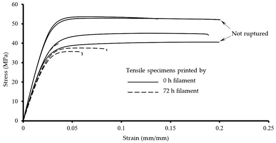 A tensile test was conducted at room temperature on specimens 3D-printed using virgin nylon filament (0 h) and moistened nylon filament (72 h). The purpose of the test was to investigate the impact of moisture content on the tensile strength of nylon materials. To achieve this, two filaments with distinctly different moisture levels (0.9% for virgin filament and 5.5% for moistened filament) were utilized. The tensile specimens were designed to conform to the ASTM D638 Type I standard, with a thickness of 4 mm, and four specimens were tested for each filament type. The resulting stress–strain curves are presented in Figure 6. As is common with 3D-printed plastic materials, some variation in mechanical properties was observed. For instance, slight differences in elastic modulus (ranging from 1.50 to 1.81 GPa) were noted among the 0 h specimens. The ultimate tensile strength varied within the range of 40–54 MPa. The elongation (at break) of 0 h specimens was more than 12%. Two 0 h specimens did not rupture during the test due to the strain limitation of the extensometer (20%). A great ductility was expected when the nylon specimens were printed using a virgin filament. The testing results of 0 h specimens are comparable or superior to the published literature of FDM or FFF nylon 6 material. For example, Lay et al. [30] compared the mechanical properties of nylon 6 fabricated by FDM and injection molding and concluded that the FDM nylon 6’s tensile strength, Young’s modulus, and elongation at break were approximately 49 MPa, 1.45 GPa, and 14%, respectively. Ramesh et al. [31] optimized the parameters for FDM nylon 6 material and observed the highest tensile strength at 43.5 MPa. Shashikumar et al. [32] also investigated the influence of parameters of FDM on the tensile properties of nylon 6 and obtained a slightly inferior tensile strength. In this study, the nylon specimens printed using the virgin filament presented tensile properties as anticipated. In contrast, the stress–strain curves for the 72 h specimens showed inferior tensile properties compared to the 0 h specimens. Those printed with 72 h moistened filament exhibited reduced Young’s modulus and ultimate tensile strength. In particular, regarding ductility, the maximum strain value for the 72 h specimens was only 8%, markedly lower than that of the 0 h specimens. Some specimens ruptured immediately after the yield point, as shown in Figure 6. Overall, the nylon specimens printed with the virgin filament (0 h) demonstrated excellent elasticity and ductility. However, both the yield strength and ultimate tensile strength were diminished due to the higher moisture content. The inferior tensile properties of the 72 h nylon specimens can be attributed to moisture-induced degradation of the filament material. Moisture acts as a plasticizer, reducing the strength and stiffness of nylon by diffusing into the material and bonding to polymer chains in the amorphous regions. This bonding forces the polymer chains apart, weakening interlayer adhesion during layer building. Furthermore, moisture-related void formation and the “pseudo-crosslinking” effect contribute to the degradation of the extruded nylon material. These combined factors result in the decreased ductility and overall mechanical performance of the 72 h specimens.