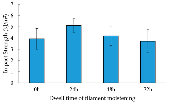 The Izod impact test was performed on nylon specimens prepared in accordance with the ASTM D256 standard. For each moisture condition, four specimens were 3D-printed. A standard notching device was used to create the notches on each sample to ensure consistency in testing. The average impact strength values are shown in Figure 7. Overall, the results indicate minimal variation in impact strength among most of the tested specimens. Notably, the specimens conditioned for 24 h displayed a slightly higher average impact strength compared to the others. However, the difference was relatively small. Given the limited number of specimens tested for each condition, it was not possible to confirm whether the observed differences were statistically significant. Therefore, no definitive conclusions could be drawn regarding the effect of moisture content on the impact strength of 3D-printed nylon parts based on these data alone. Further testing with a larger sample size is necessary to establish any meaningful trends or correlations.