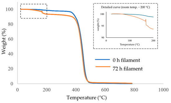 TGA curves of 0 h and 72 h moistened nylon filaments.