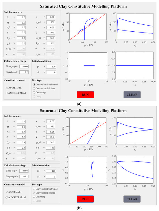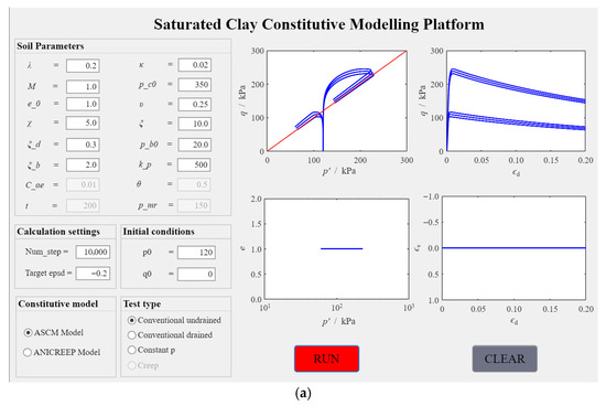 Axes “UIAxes_1” to “UIAxes_4” are employed to display simulation results from triaxial undrained tests, triaxial drained tests, and constant-p’ tests, including stress–strain curves such as q-p’, q-εd, e-p’, εv-εd. For creep tests, axes “UIAxes_5” and “UIAxes_6” are utilized to replace “UIAxes_3” and “UIAxes_4”, thereby enabling the visualization of creep test simulation results, specifically p’-t and εd-t curves. By default, the platform displays axes “UIAxes_1” through “UIAxes_4”, while the “Visible” property of axes “UIAxes_5” and “UIAxes_6” is set to “Off”, making these two axes invisible by default, as illustrated in Figure 4b.