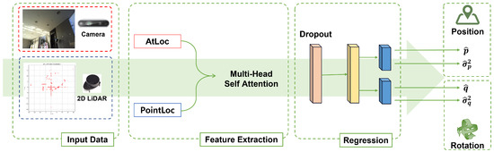 To better understand the underlying mechanism, we first describe the FusionLoc network architecture and its pose estimation process. FusionLoc takes the input data, consisting of an RGB image and 2D LiDAR data , as shown in the input data part of Figure 1, and predicts the robot’s position and orientation , which are the outputs of the original FusionLoc, as follows: