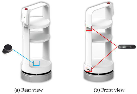 A serving robot used in this study: The blue box represents a SLAMTEC RPLiDAR A1M8, while the red boxes indicate Intel RealSense D435 cameras.