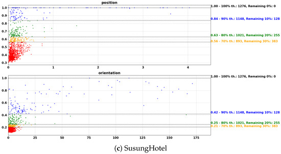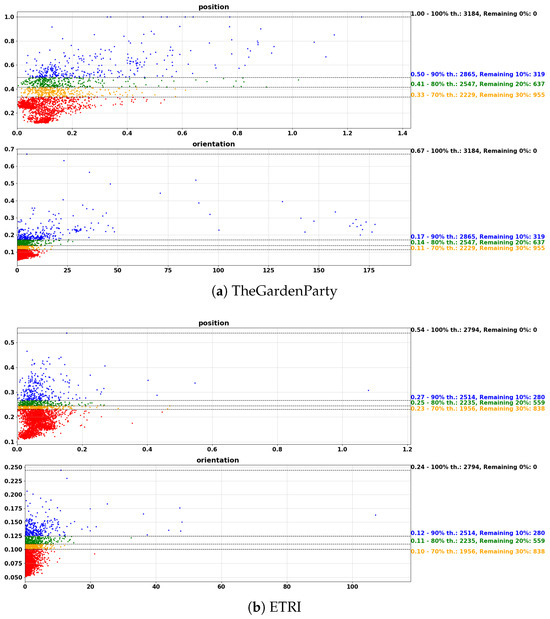 Figure 5 illustrates the distribution of position and orientation errors after applying the uncertainty-based rejection approach. Each scatter plot shows error values on the x-axis and their corresponding uncertainties on the y-axis. The outputs from the network are color-coded to distinguish between low-uncertainty (more reliable) and high-uncertainty (potentially erroneous) outputs. In the figure, red dots represent outputs with low uncertainty (below the 70% threshold), which are considered reliable predictions. They remain after applying all thresholds (100%, 90%, 80%, and 70%). On the other hand, blue dots indicate high-uncertainty outputs that are rejected when the 90% threshold is applied, meaning a higher likelihood of being erroneous. Additionally, green and orange dots represent outputs with moderate uncertainty, positioned between the red and blue dots. The black dashed lines in each plot indicate the rejection thresholds applied at different percentages. As the threshold decreases (from 100% to 70%), the number of low-uncertainty outputs (red) increases, while high-uncertainty outputs (blue) are progressively discarded. On the right side of each plot, the first number represents the uncertainty threshold applied at that level, while the percentages and corresponding values indicate the number of the remaining outputs. Overall, we can see that this strategy can effectively enhance the reliability of the network outputs by rejecting those with high uncertainty. In Figure 5, we also observe that applying a 70% threshold led to the removal of 955 outputs from the TheGardenParty dataset, 838 outputs from the ETRI dataset, and 383 outputs from the SusungHotel dataset. This indicates that excessive rejection can result in data loss and require multiple inferences to provide a non-rejected output, while the rejection approach effectively reduces errors on average. Thus, it is crucial to determine an appropriate threshold. Experimental results indicate that the 70% threshold achieves a satisfactory rejection while maintaining a sufficient number of network outputs. However, in a specific application, the rejection ratio should be carefully adjusted to balance performance improvement and multiple inferences. Therefore, selecting an optimal threshold is essential to maximizing performance while preserving sufficient data for model learning.