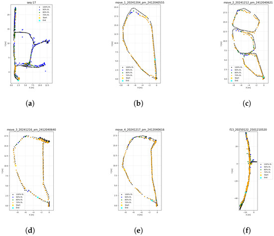 Trajectory visualization with different uncertainty thresholds (100%, 90%, 80%, 70%). (a) TheGardenParty. (b) ETRI: Full-loop trajectory. (c) ETRI: Zigzag navigation. (d) ETRI: Localized back-and-forth motion. (e) ETRI: In-place rotations at specific locations. (f) SusungHotel.