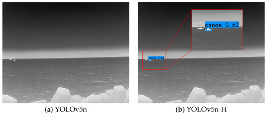 As illustrated in Figure 11, the YOLOv5n fails to detect the canoe target, which occupies less than of the image area. Due to insufficient confidence (namely, below the threshold), no valid bounding box is generated, and the existing low-confidence outputs indicate the limited sensitivity of the model to small-scale features in cluttered infrared scenes. By introducing an attention mechanism into the detection head, the YOLOv5n-H demonstrates improved localization accuracy for the canoe, with the confidence score increasing to . Additionally, background interference, such as wave textures, is effectively suppressed, reducing false positives. Nevertheless, while target localization is enhanced, some small targets remain undetected, and the predicted bounding boxes still exhibit boundary overlap with the background. This indicates that the head-level attention mechanism improves discrimination between foreground and background but remains sub-optimal under severe noise or low-saliency conditions.