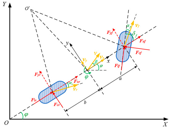 In Figure 2, OXY represents the inertial coordinate system; oxy represents the vehicle body coordinate system; a and b are the distances from the front and rear axle centers to the center of mass; Fcf and Fcr are the cornering forces on the front and rear wheels; αf and αr are the tire slip angles of the front and rear wheels; Flf and Flr are the longitudinal forces on the front and rear wheels; Fxf and Fxr are the x-direction forces on the front and rear tires; Fyf and Fyr are the y-direction forces on the front and rear tires; δf, β are the front wheel steering angle and the side slip angle of the center of mass, respectively; v is the velocity of the vehicle’s center of mass, vx is the longitudinal component of the center of mass velocity, vy is the lateral component of the center of mass velocity; and and are the vehicle yaw angle and yaw rate, respectively.
