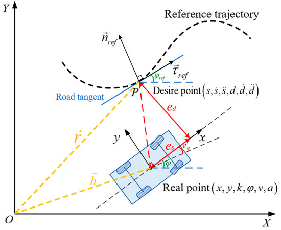 In the Frenet coordinate system, the lateral error ed is the lateral distance from the center of mass of the vehicle to the reference trajectory point P; the longitudinal error es is the longitudinal distance from the center of mass of the vehicle to the reference trajectory point P; and is the angle between the tangent of point P on the reference trajectory and the X-axis, the heading angle error is , and the road curvature of point P on the reference trajectory is . The car trajectory tracking error equation is summarized as Equation System (11):