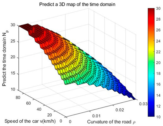 Based on the vehicle characteristics and performance requirements, the parameters are calibrated to obtain a predicted horizon offline database. Combined with the vehicle model and control algorithm, the three-dimensional distribution of the prediction horizon concerning vehicle speed and road curvature is obtained, as shown in Figure 4.
