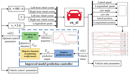 By linearizing and discretizing the nonlinear state space, a linear time-varying prediction model is established. In the prediction horizon, the difference between the current state and the control input is used to predict the future system state and output, iterating continuously [24]. Then, the rolling optimization of Model Predictive Control is performed by establishing the objective function of the system and the constraints during the driving process, followed by optimization and solution.