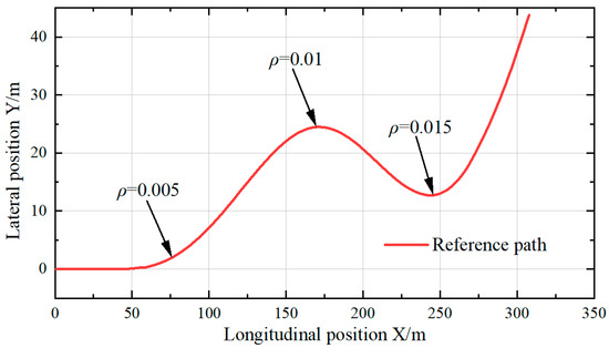 To verify the performance of the designed controller at higher vehicle speeds and on roads with varying curvatures, this paper sets a path with changing curvature. The path is divided into three segments with small, medium, and large curvature changes. The maximum curvatures of these segments are 0.005, 0.01, and 0.015, respectively, simulating the driving conditions of the controller in different bends. As shown in Figure 7.