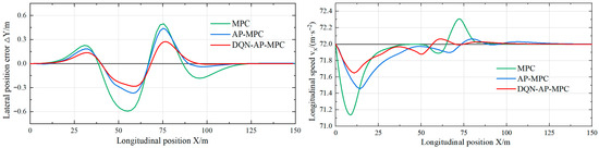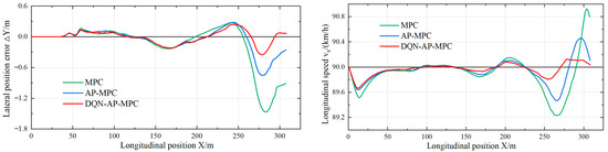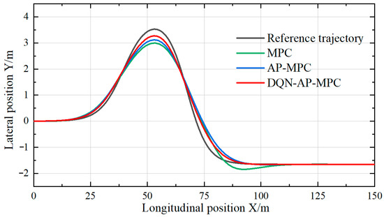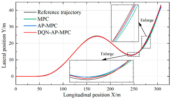 Firstly, the tracking performance comparison of the unimproved MPC controller (MPC), the adaptive predictive horizon MPC controller (AP-MPC), and the adaptive predictive horizon MPC controller, based on deep Q-network (DQN-AP-MPC), on variable curvature roads at a speed of 90 km/h is shown in Figure 9 and Figure 10.