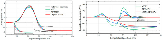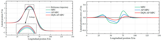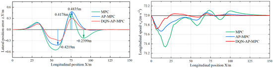 From Figure 13, it can be seen that under medium-speed conditions, compared to MPC, the maximum tracking error of AP-MPC is reduced by 29.23%, and the maximum tracking error of DQN-AP-MPC is reduced by 59.51%. The average absolute error of DQN-AP-MPC is 0.0366 m, which is a 66.57% reduction compared to MPC. Compared to high-speed conditions, the performance improvement of the enhanced trajectory tracking controller is more significant.