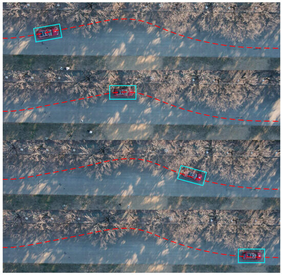Top view of real vehicle experiment. The dashed line represents the reference path, and the box is used to highlight the actual position of the intelligent vehicle.