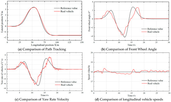 To ensure the safety and controllability of the experiment, the real vehicle experiment was conducted at a controlled speed of 18 km/h. The results of the real vehicle experiment are shown in Figure 20. The chattering of the data in the figure is caused by the combined effects of the inherent characteristics of the system and external environmental interference, which are inevitable to some extent in practical applications. This is a common phenomenon in trajectory tracking control processes.