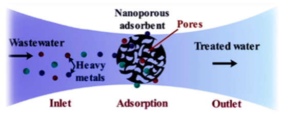 Diagrammatic representation of adsorption of heavy metals from contaminated wastewater onto a porous adsorbent. The wastewater is treated and has reduced heavy metals present. The figure was adapted from Qasem et al. [11].