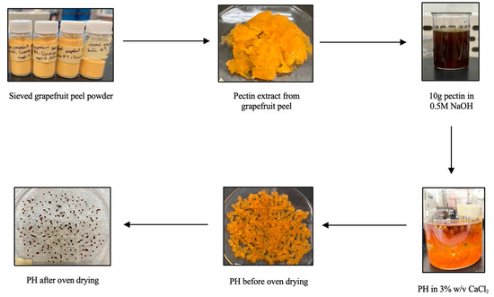 To synthesize pectin hydrogels (PH), approximately 1.70 g of pectin powder was combined with 80 mL of 0.5 M NaOH and stirred at room temperature for 1 h. The solution was incubated for 4 days at room temperature to stimulate gelatinization. Then, the solution was added dropwise with a 12 mL Fisherbrand plastic syringe (Air-Tite Luer-Lock, Virginia Beach, VA, USA) into a 200 mL solution of 3% w/v CaCl2 and left for 24 h to stabilize. Afterwards, 50 mL of methanol and 15 mL of 0.5 M NaOH was added to the beads and stirred slightly with a stir rod, then incubated at room temperature for 1 h. Subsequently, the beads were isolated by vacuum filtration using DI water to facilitate transfer and washes. The orange beads were dried in an oven at 60 °C for 24 h, lyophilized for 28 h (8 h freezing, 20 h drying), then stored in 20 mL scintillation vials at −15.55 °C for further use.