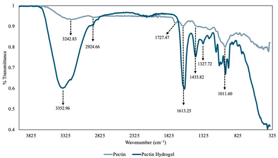 The FT-IR spectra of pectin and PH were acquired to observe which functional groups were present in each sample. A Bruker Alpha-P ATR FT-IR (Diamond ATR, Bruker, Billerica, MA, USA) was used to conduct the analysis. The PHs were ground to a fine powder using a mortar and pestle before analysis. The spectra were recreated using the Microsoft Excel program.
