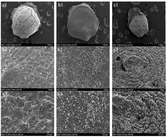 Scanning Electron Microscopy (SEM) images of the surface structure of pectin hydrogel (PH) before adsorption (a1–a3), PH after adsorption (b1–b3) and pectin hydrogel–metal organic framework (PHM composites) before adsorption (c1–c3) at various magnifications (1.0 mm, 100 µm and 50.0 µm). The hydrogels were lyophilized prior to SEM analysis.