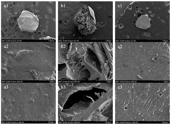 Scanning Electron Microscopy (SEM) images of the cross-sectional structure of pectin hydrogel (PH) before adsorption (a1–a3), PH after adsorption (b1–b3) and pectin hydrogel–metal organic framework (PHM composites) before adsorption (c1–c3) at various magnifications (1.0 mm, 100 µm and 50.0 µm). The hydrogels were lyophilized prior to SEM analysis.