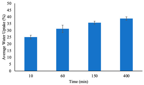 The ability of PHs to absorb and retain water was evaluated over time, and the results are summarized in Figure 8. The percentage of water uptake by PH increased progressively with time, which indicated the hydrogel’s ability to swell as it absorbed water molecules. At 10 min, the water uptake was 25.09 ± 1.38%, which demonstrated the hydrogel’s initial rapid swelling phase from 0 min. This suggests that the structure of PH allows for immediate water diffusion into the hydrogel [32].