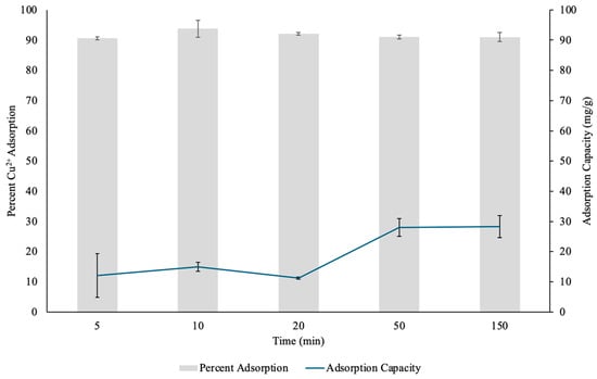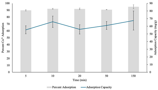 The percent Copper2+ (Cu(II)) uptake and Cu(II) adsorption capacity (mg/g) determined through contact time test by pectin hydrogel–metal organic framework (PHM composites) placed in 10 mL Cu(II) solutions over five different time points. The hydrogels were lyophilized prior to analysis. The error bars represent the standard deviation (n = 3).