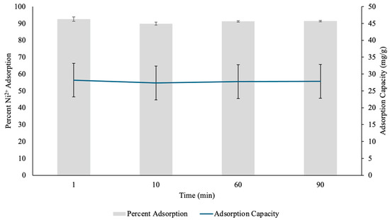 The percent Nickel2+ (Ni(II)) uptake and Ni(II) adsorption capacity (mg/g) determined through contact time test by pectin hydrogels (PH) placed in 10 mL Ni(II) solutions over five different time points. The hydrogels were lyophilized prior to analysis. The error bars represent the standard deviation (n = 3).