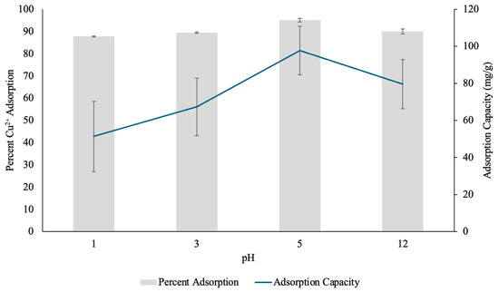 The effect of the pH of Cu(NO3)2·3H2O solution on metal adsorption by PH was investigated. Approximately 0.020–0.030 g of dried PH was immersed in 10 mL of a 50 ppm solution of Cu(NO3)2·3H2O. The 50 ppm solution was adjusted to pH 1, 3, 5 or 12 prior to the addition of the beads. The mixture was stirred with a stir bar in a 20 mL scintillation vial for 120 min. After the stirring was completed, the mixture was decanted to a new 20 mL scintillation vial without the beads, and the solution was diluted to make a 50 mL 5 ppm solution. The diluted solutions were filtered, and the copper concentration was analyzed by FAAS. The optimal pH for adsorption of copper by PH was determined using percent removal Equation (3) and adsorption capacity (qe) Equation (4), where V denotes the volume (L) and m denotes the initial mass (g) of beads used.