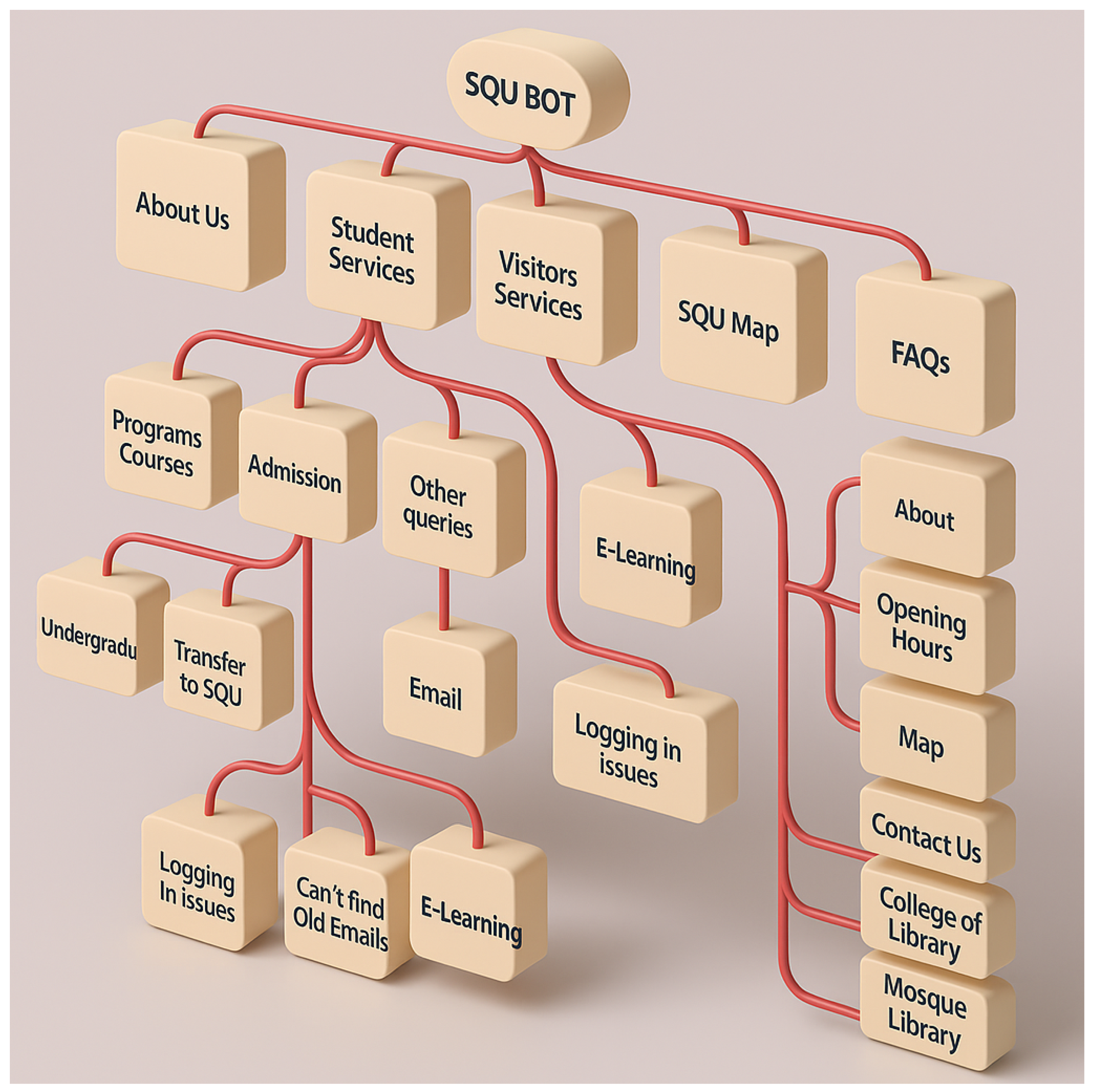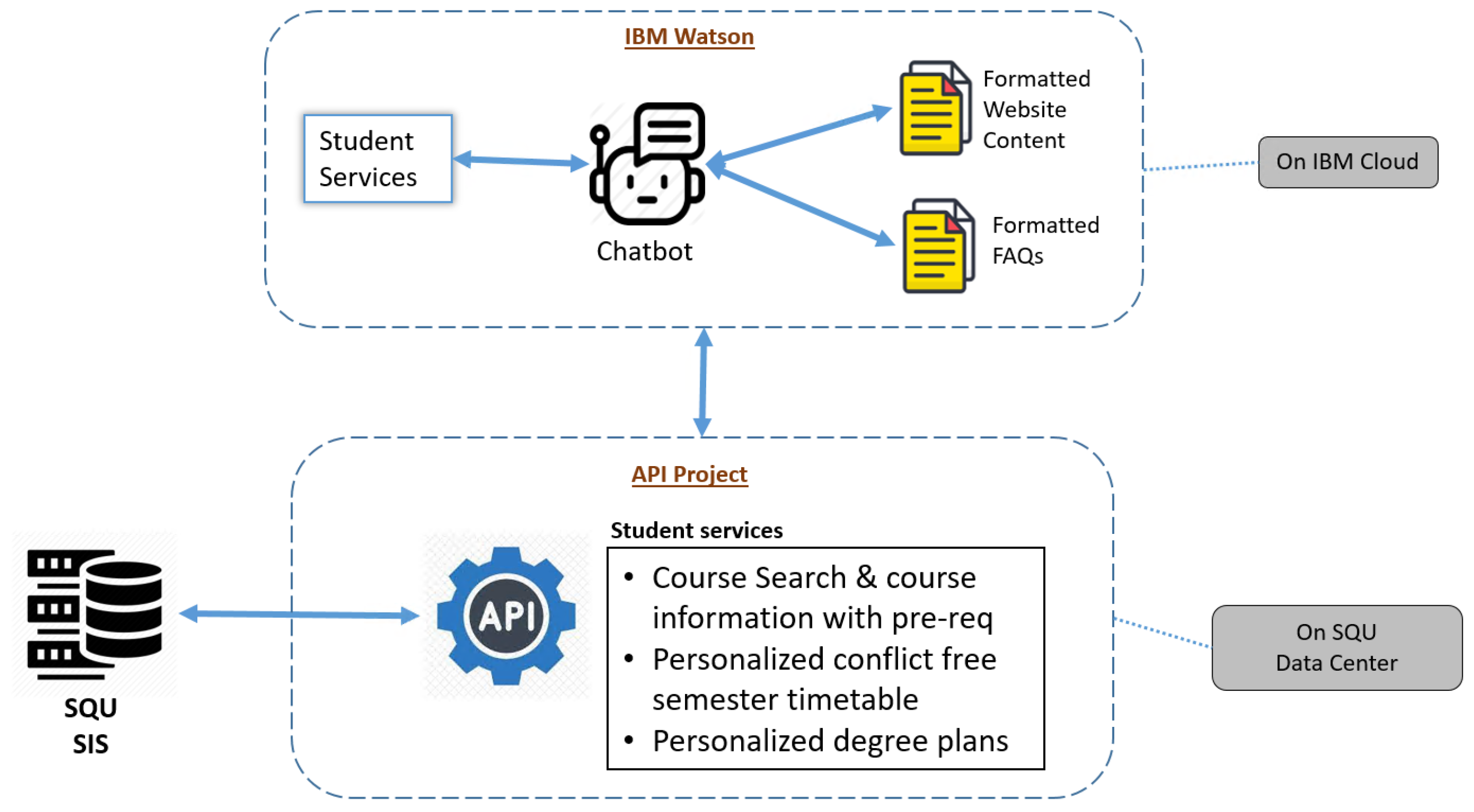 - General Services: Information regarding university policies, calendars, contact directories, and course offerings was manually extracted from the SQU website and structured into training data for IBM Watson.