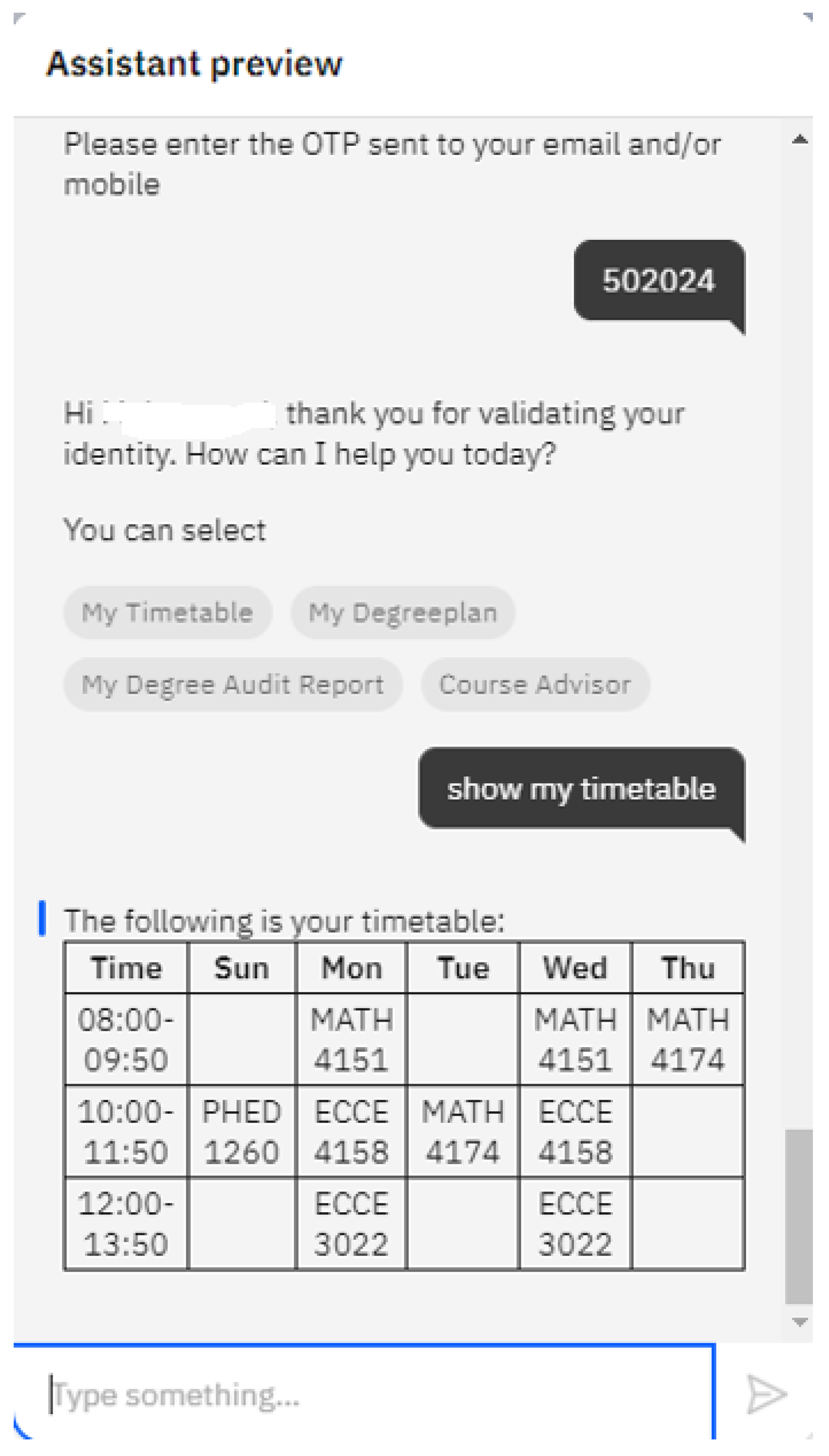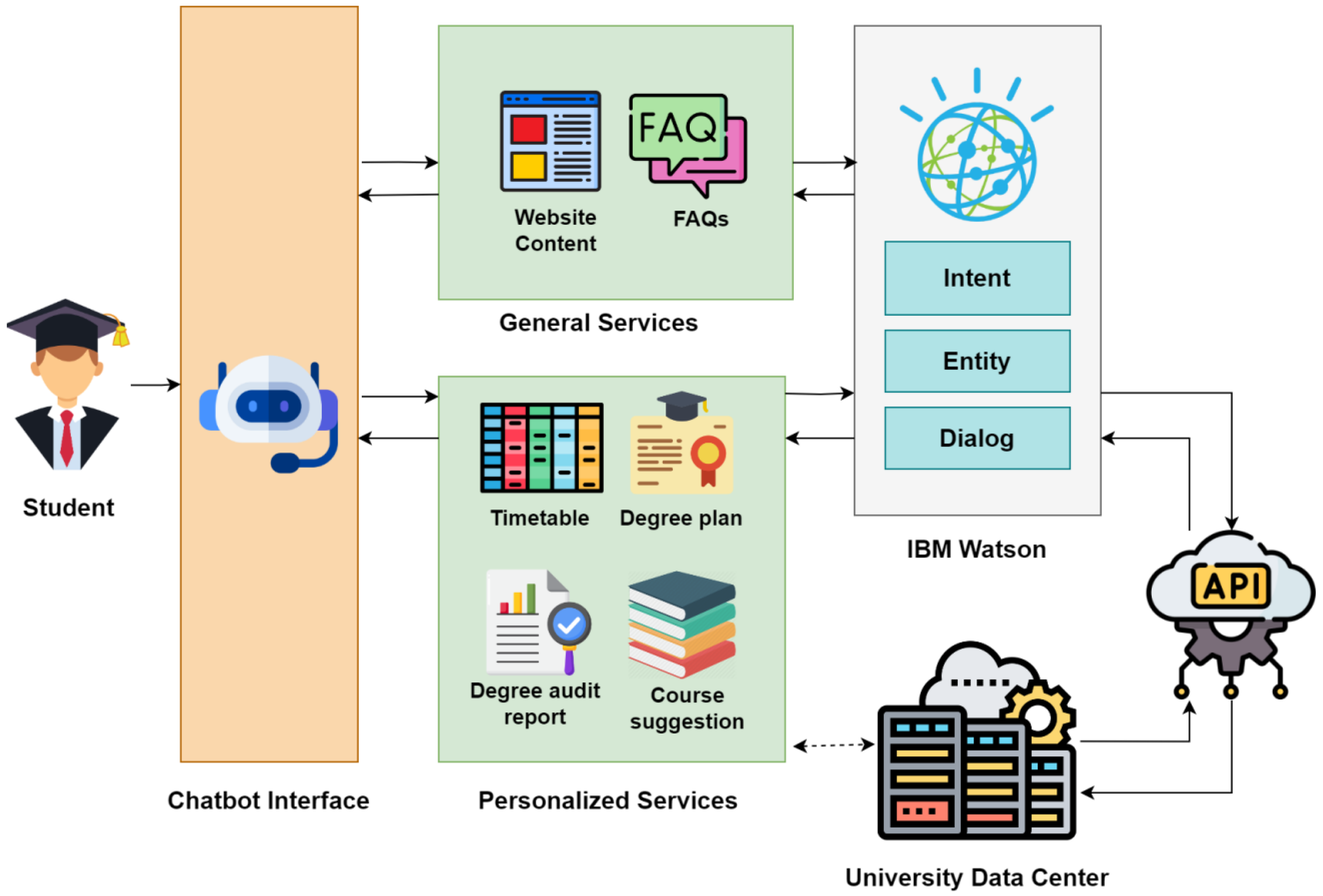 - Personalized Services: For personalized queries (e.g., retrieving student timetables, degree plans, or audit reports), data is accessed via a custom API layer that connects IBM Watson with secure university databases. No sensitive data is stored in the cloud, ensuring compliance with privacy standards.