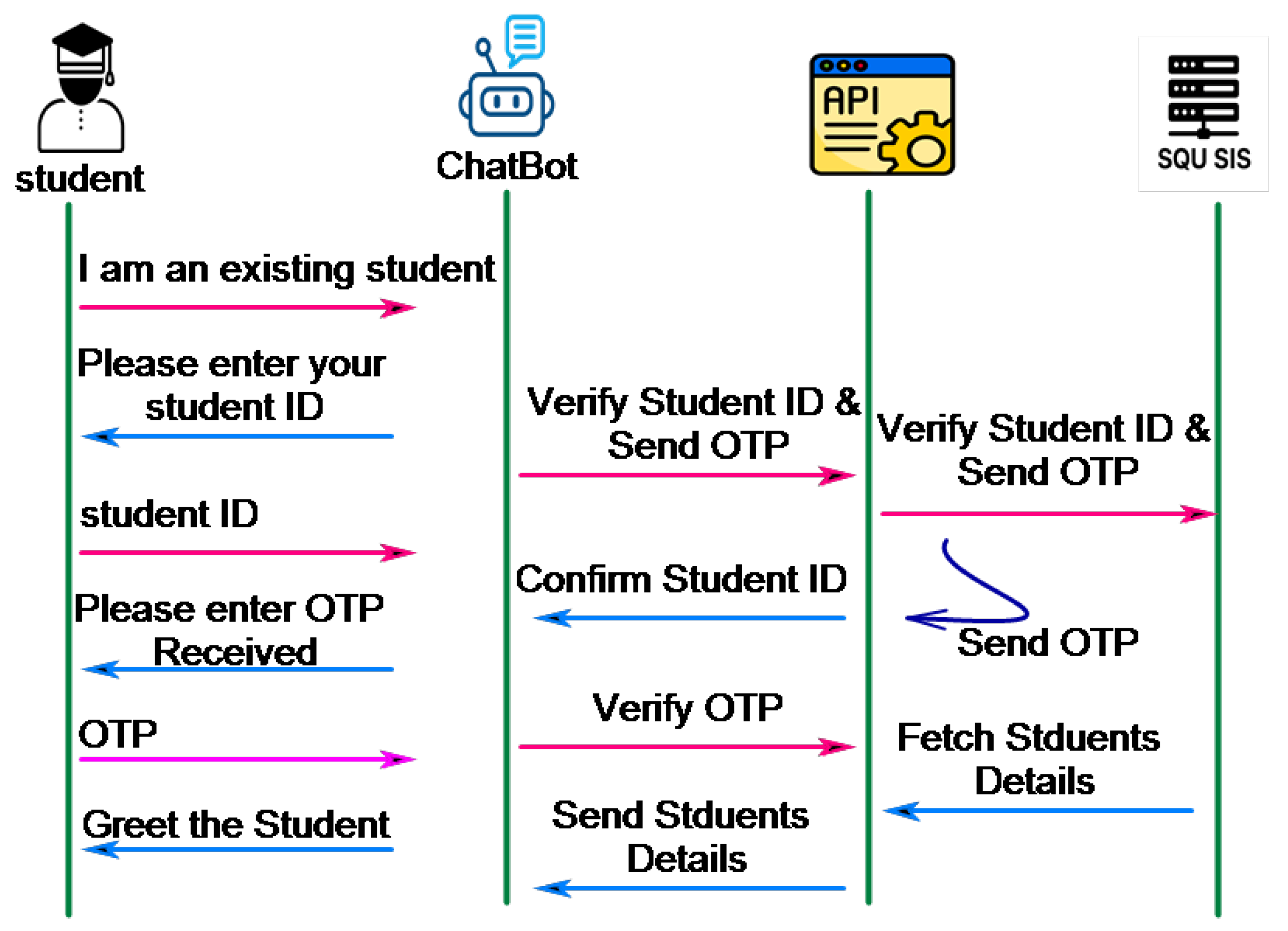 - Student verification: The SQUbot is capable of tailoring the search results according to the needs of the individual students. To provide personalized services to the students, the bot first verifies the student. Student verification is crucial for maintaining security and protecting students’ privacy by ensuring that only authorized students can access their information. Student verification is a prerequisite for using students’ personalized services using SQUbot. The bot uses the One Time Password (OTP) method to verify a student before they use any of the personalized services. If the user is an existing student, the chatbot first asks the student to enter their student ID and then calls an API endpoint to send an OTP SMS to the student’s mobile number. Students have to enter the correct OTP to proceed. Once verified, students can use personalized services without needing to verify again. Figure 6 shows how the chatbot verifies the student ID for providing personalized services. Also, the following figures demonstrate the process by which the chatbot checks the student’s ID to offer tailored services. After getting verified, the student can quickly access the following services: