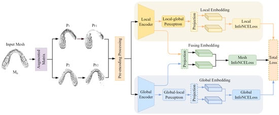 (2) We design a dual-stream encoder architecture (local–global) to extract deep-level features while enhancing the synergistic relationships between feature representations. Through contrastive learning-based encoder pre-training, the system learns universal dental feature representations, effectively capturing the potential geometric characteristics of dental models.