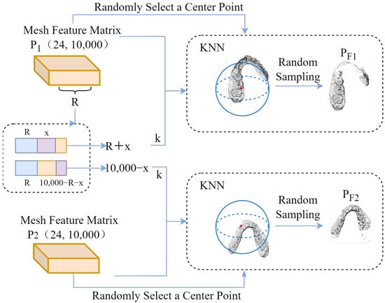 The two relative transformation matrices are applied to M0 to obtain the augmented samples M1 and M2. For the augmented samples, the key dental features are extracted to convert them into 24-dimensional feature matrices P1 and P2 with 10,000 meshes. The k-nearest neighbor search algorithm is used to randomly select partial meshes of the two augmented samples. In order to make the paired data similar, when the two randomly selected partial meshes are mapped back to the original sample M0, a certain number of repeated meshes should be included to form correspondence. The specific process is shown in Figure 2.
